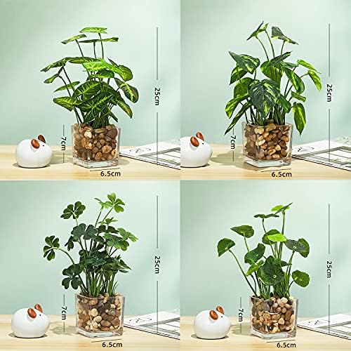 XONOR Artificial Potted Plants, Set of 4 Faux Tabletop Greenery with Clear Glass Pots and Cobblestones, Included Artificial Taro, Lotus, Clover and Ivy for Home Office Décor