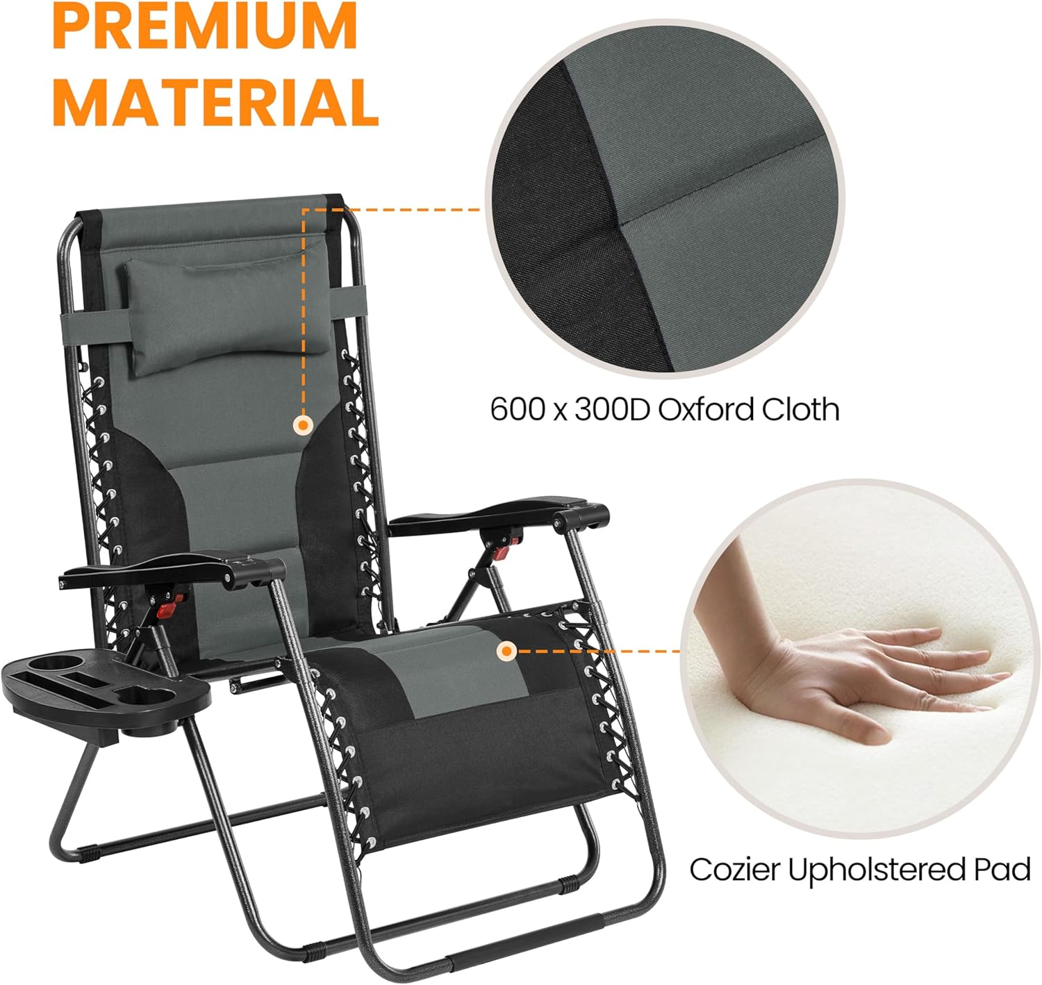 Made of 600*300D Oxford cloth, the fabric part of this zero gravity outdoor recliner features lightweight, high durability, and wear-resistance, performing well in weather resistance, making this chair perfect for serving outdoors