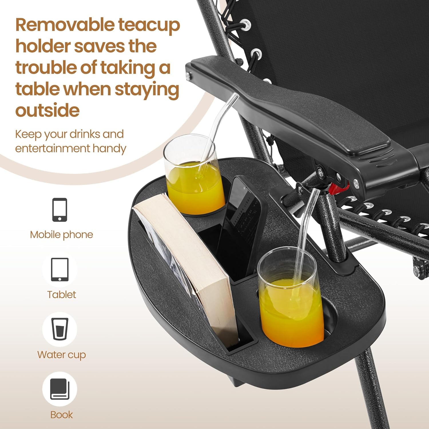 Each Each folding recliner is provided with a detachable tray, capable of holding 1 phone, 1 pad, and 2 cups or bottles. The 50 cm L × 50 cm W × 50.5 cm Height side table also comprises 2 cupholders. With this outdoor furniture set, your belongings can be kept easily accessible