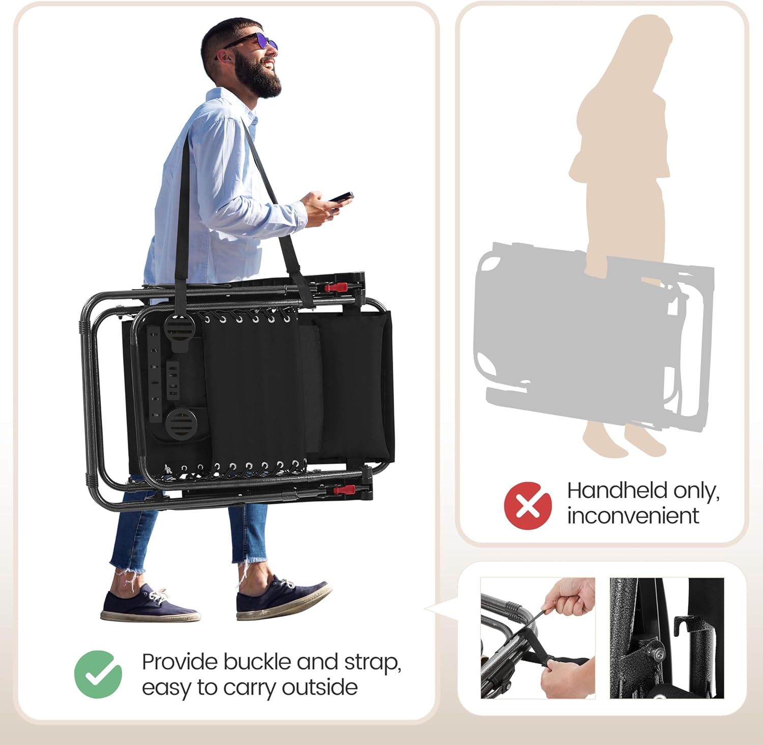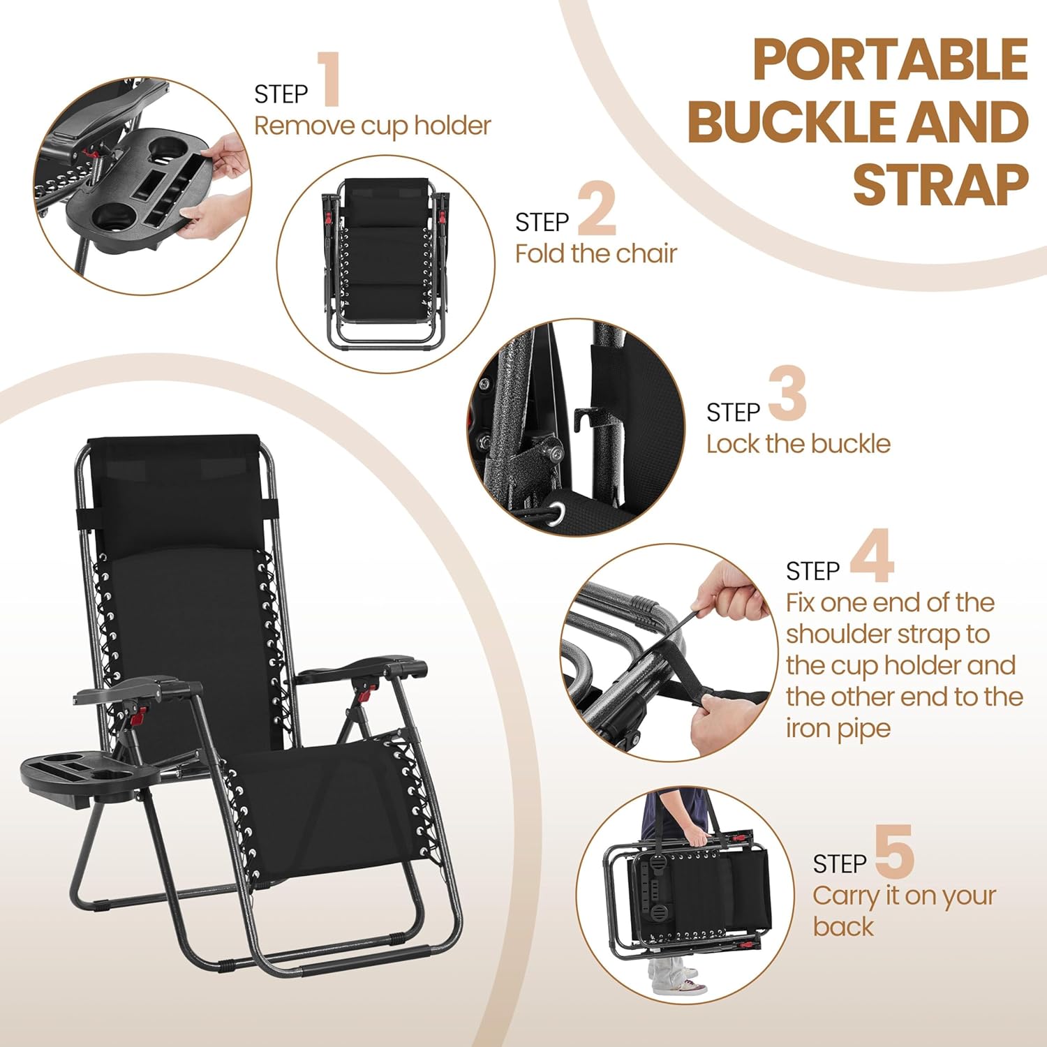 【Solid & Stable Construction】The support frame made of high-hardness and lightweight painted steel is designed in a triangle structure when this chair is unfolded in backrest-upright and zero gravity modes, ensuring your safety and stability. This folded recliner is capable of holding up to 114 kg/ 251 lb