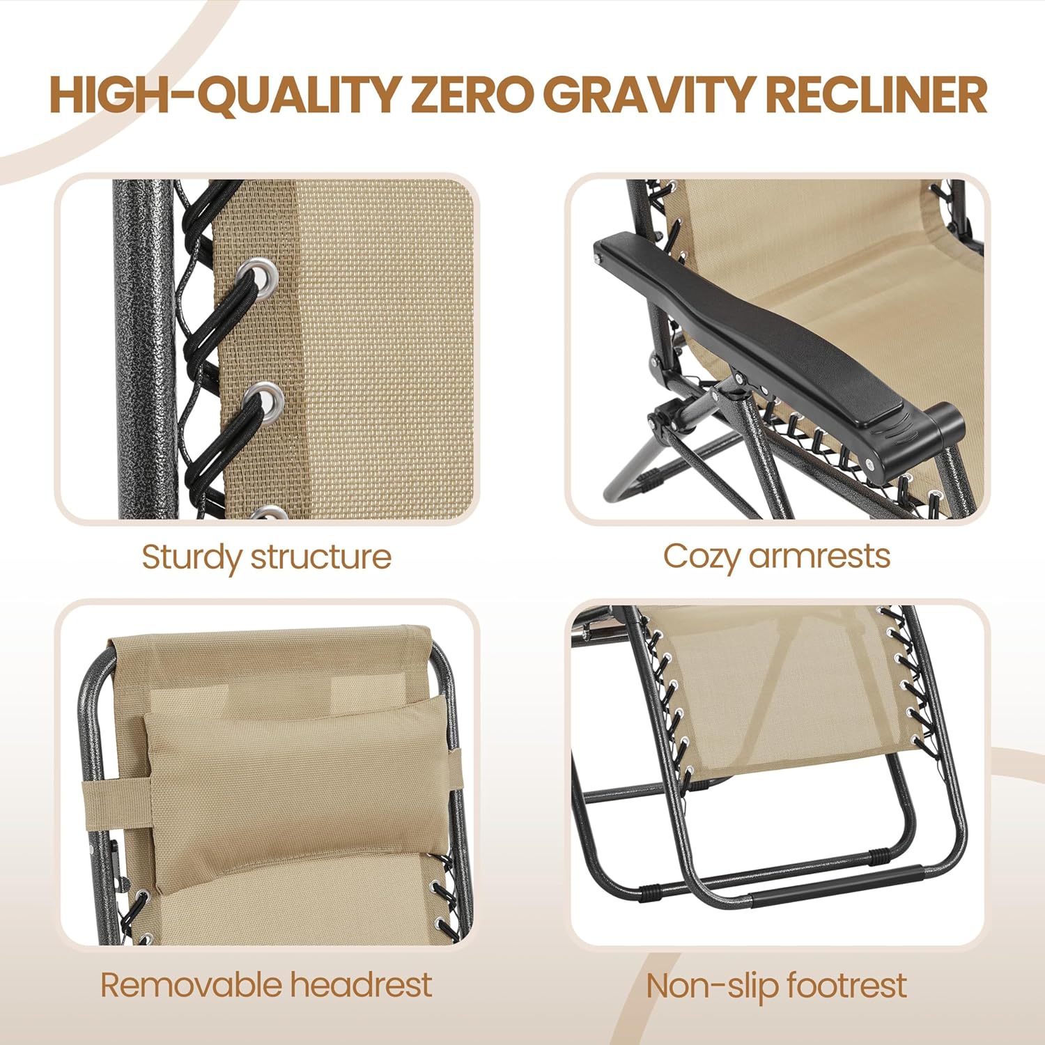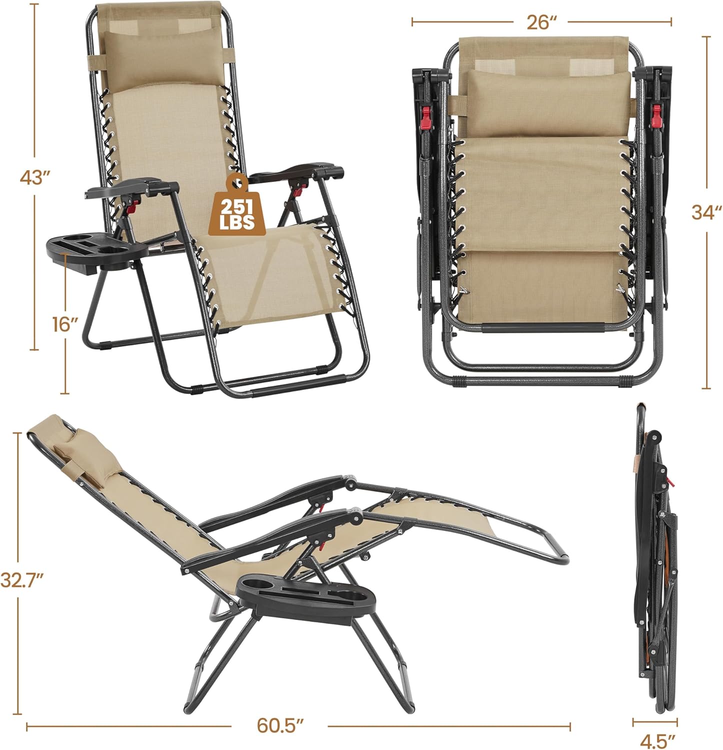 Yaheetech Zero Gravity Recliners Outdoor Adjustable Folding Reclining Lounge Chairs w/Pillows, Cup Holder Trays and Carry Strap for Patio Backyard Beach Beige Set of 2