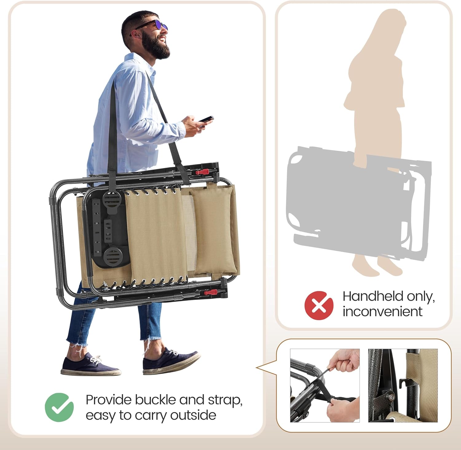 【Buckle & Strap for Carry Out】Once folded, simply buckle the chair to secure it in place. For easy transport, we provide shoulder straps so you can carry it comfortably on your shoulder instead of in your hands