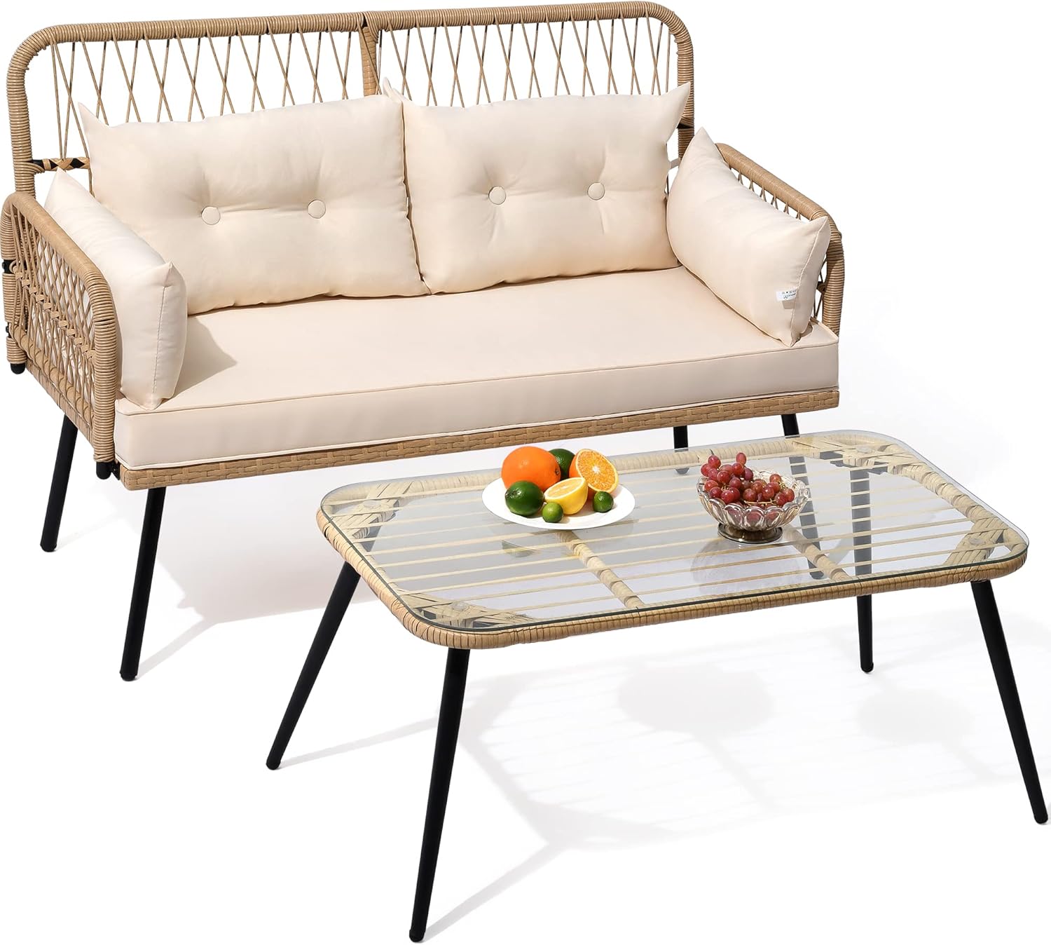 YITAHOME 2-Piece Patio Furniture Wicker Outdoor Loveseat, All-Weather Rattan Conversation for Backyard, Balcony and Deck with Soft Cushions and SideTable (Light Brown+Beige)