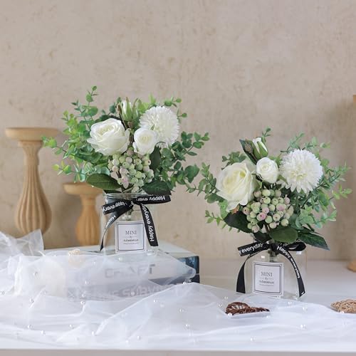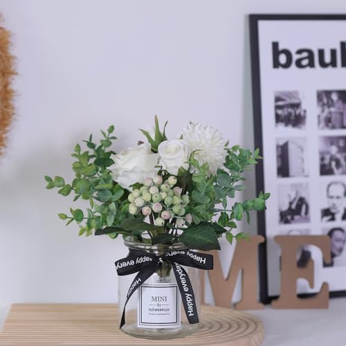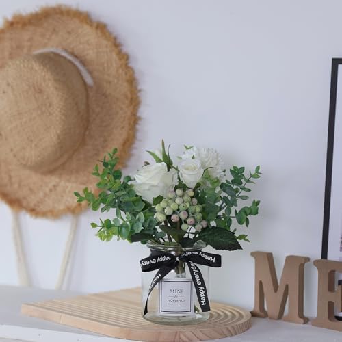 【Artificial flowers with vase include】: 3 white artificial silk roses,1 white hydrangeas, faux berry,fake eucalyptus and a glass vase with silk ribbon . Bouquet and the size of the vase is perfect collocation, is the ideal choice for you centerpiece table decorations.
