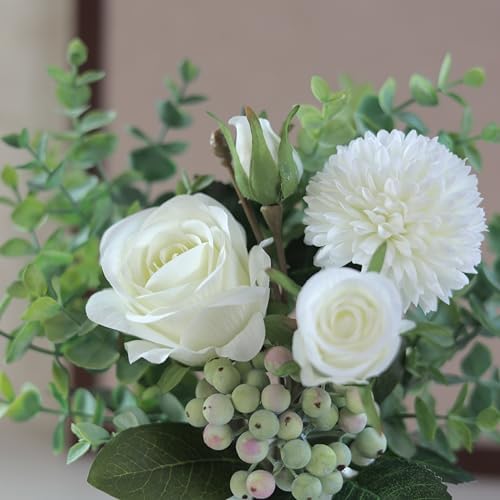 YXZZWL Artificial Flowers with Vase,Faux Silk Roses Eucalyptus Fake Berry in Vase Centerpiece Table Decorations for Coffee Table, Living Room,Dining Table,Office,Farmhouse,Kitchen,Home Decor (White)