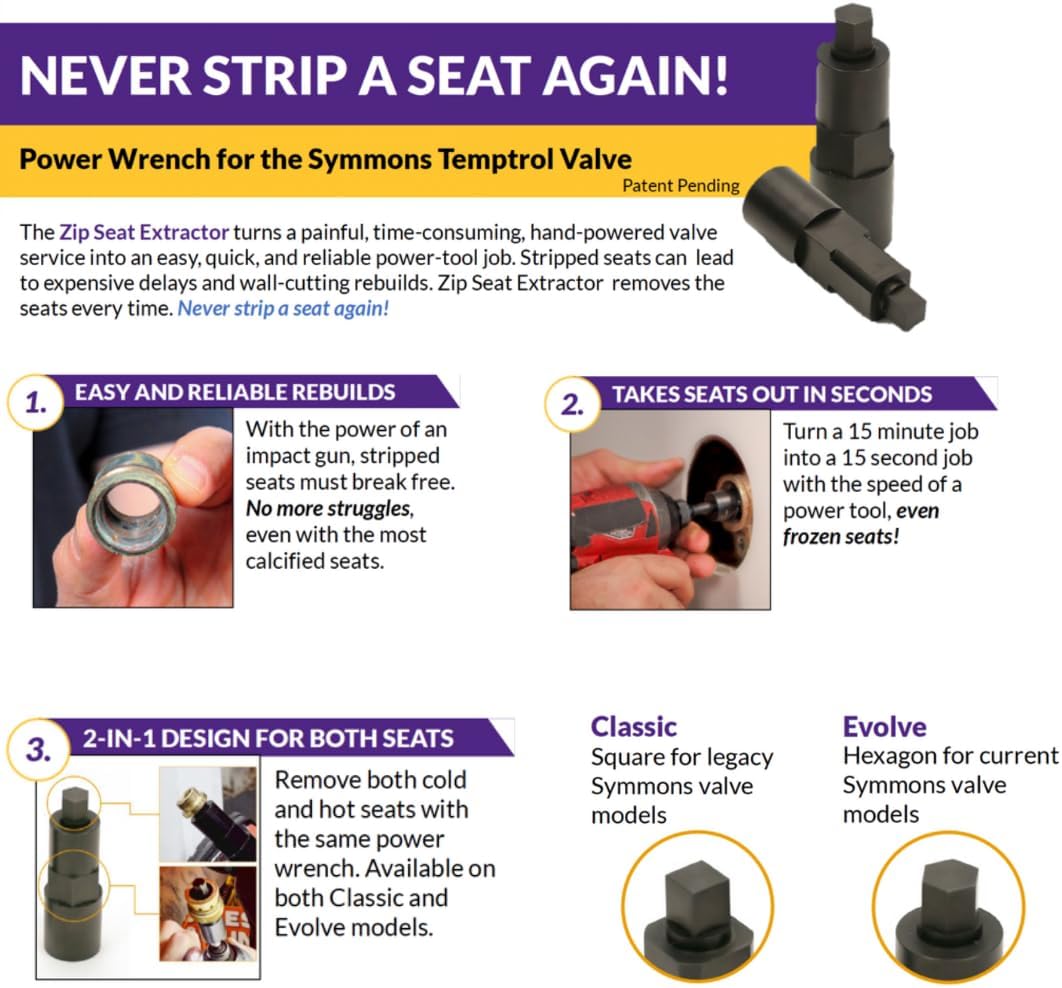 π—ͺ𝗒π—₯π—žπ—¦ 𝗒𝗑 𝗕𝗒𝗧𝗛 π—Ÿπ—˜π—šπ—”π—–π—¬ 𝗔𝗑𝗗 π—‘π—˜π—ͺ 𝗦𝗬𝗠𝗠𝗒𝗑𝗦 π—©π—”π—Ÿπ—©π—˜π—¦!: Enhance your maintenance capabilities with a faucet installation tool, boasting Classic, Evolve, and Diverter Extractors, complemented by a powerful power drill bit, ensuring a comprehensive answer to diverse seat extraction requirements, including those for frozen seats or stripped seats. While other tools only work on the older Symmons valve design, Zip Seat Extractor works on both old and new valve designs.